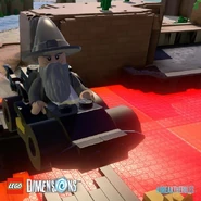 The Batmobile was first seen at the prologue in Gotham City when Batman and Robin were pursuing Bane to retrieve the Kryptonite he had stolen. When Robin was sucked into a mysterious portal, Batman used the Batmobile to pursue him, arriving in the Mines of Moria during Gandalf's battle with the Balrog where it was destroyed. But, after being transported to Vorton World, Batman along with Wyldstyle and Gandalf were able to rebuild it in order to power the inert portal, continuing to use it for several difficulties along their journey.