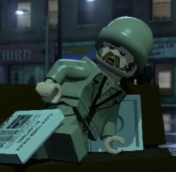 On October 26, 1985, after Marty McFly drove back to his present day in the DeLorean time machine and crashed into the Assembly of Christ, Red woke up, saw this and commented on him being a "crazy drunk driver". Marty apparently knows him, if not happy to see him upon his return. He was also present in 1985A and is one of the only individuals in 1985A to not be altered at all, as he still seems to be a street bum. In this alternate reality, Marty bumped into him outside a nightclub and Red, not recognizing him, yelled; "Watch where you're goin', you crazy drunk pedestrian!!".
